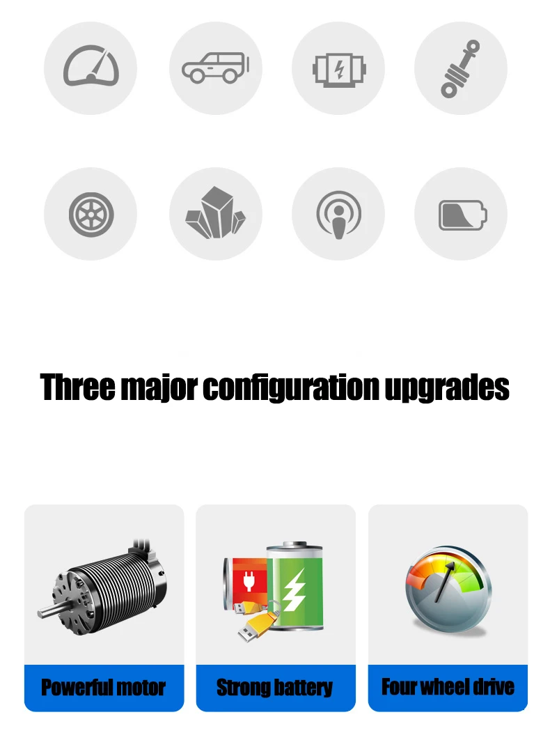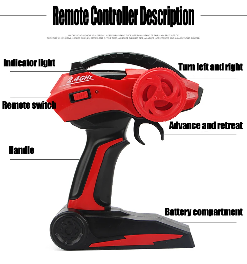 • 2.4G Radio Remote Control :Control the car from a distance with the 2.4G radio remote control.